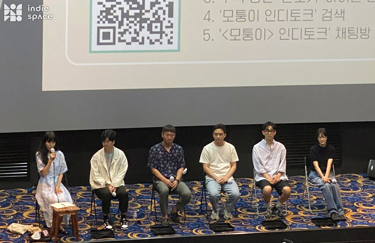 공민정 배우(이하 공민정): 안녕하세요, 저는 오늘 영화 〈모퉁이〉 인디토크 진행을 맡은 공민정입니다. 〈모퉁이〉의 신선 감독, 이택근, 하성국, 박봉준, 백수희 배우를 모시고 이야기 나눠보려고 합니다. 저에게 오늘은 조금 특별한 날이에요. 저랑 너무 가까이 있는 영화거든요. 말씀드리면 저희 건대 동문이에요. 후배 분도 있고 새로운 얼굴도 있지만 대부분 저랑 동기고, 특히나 제가 감독님과 동기이기 때문에 감독님에 대해서 조금은 알고 있어서 더 와닿는 지점이 있었어요. 십몇년을 봤기봤기 때문에 영화를 보고 '정말 오빠 같은 영화가 나왔구나, 이 사람과 정말 닮아 있는 영화가 나왔구나'라는 생각이 들었어요. 처음에는 영화가 좋든 안 좋든, 좋은 마음으로 응원해 주고 싶고 영화가 잘 됐으면 좋겠다는 마음으로 봤는데 영화가 정말 너무 좋은 거예요. 처음부터 끝까지 집중이 됐고 눈을 뗄 수 없었던 것 같아요. 대사 하나하나가 허투루 쓰인 게 없고 어떻게 이렇게 리얼리티를 연출할 수 있는지 감탄했어요. 연출도 그렇고 연기는 또 본인이 많이 드러나는 연기, 어떤 사람인지가 보이는 연기를 개인적으로 좋아하는데 캐릭터들이 다 그렇게 드러났던 것 같아요. 그래서 개인적으로 저는 영화를 너무너무 잘 봤다고 말씀드리고 싶고 좋은 영화를 만들어줘서 너무너무 감사드립니다.