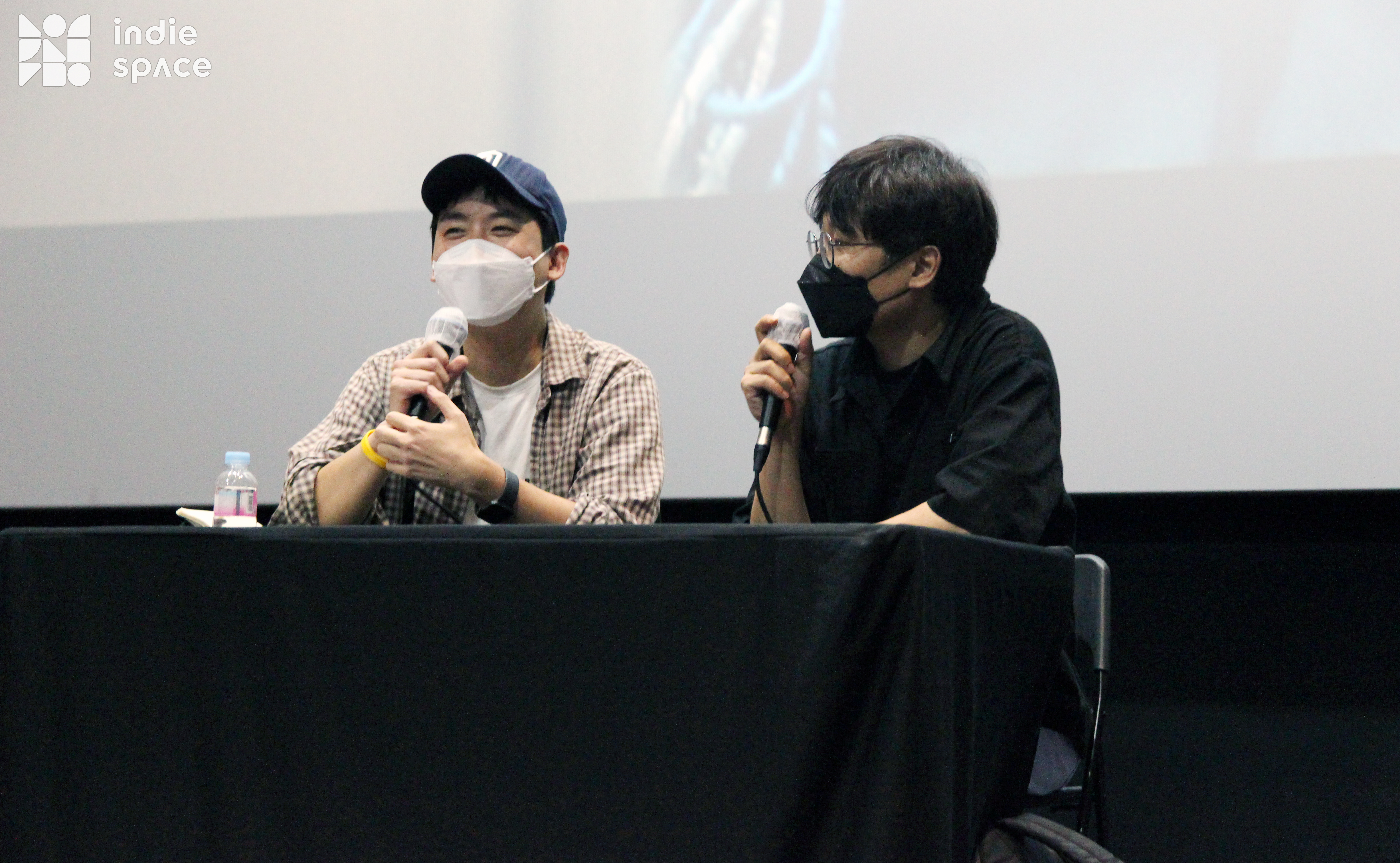 최이다 감독(이하 최이다): 안녕하세요, 진행을 맡은 최이다입니다. 간략하게 월례비행을 소개하자면 비평과 함께하는 독립영화 정기상영회로, 인디포럼이 인디스페이스와 함께 주관을 하고 있습니다. 중단되었던 월례비행이 2017년에 부활할 때 상영했던 작품이 〈초행〉이라는 조현철 배우님 주연작이었어요. 5년 뒤에 다시 이곳에 연출자로 오시게 되었습니다. 조현철 감독님과 이태안 감독님 큰 박수로 맞이해 주세요. 여러분들께서 질문을 생각하시는 동안 먼저 소개 같은 질문으로 시작을 해볼까 합니다. 두 분께서는 제가 알기로는 학교에서부터 공동연출이나 협업을 자주 하셨던 것 같습니다.