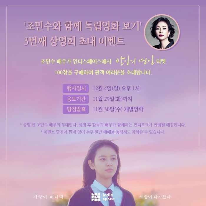 * 상영 전 조민수 배우의 무대인사, 상영 후 감독과 배우가 함께하는 인디토크가 진행될 예정입니다.