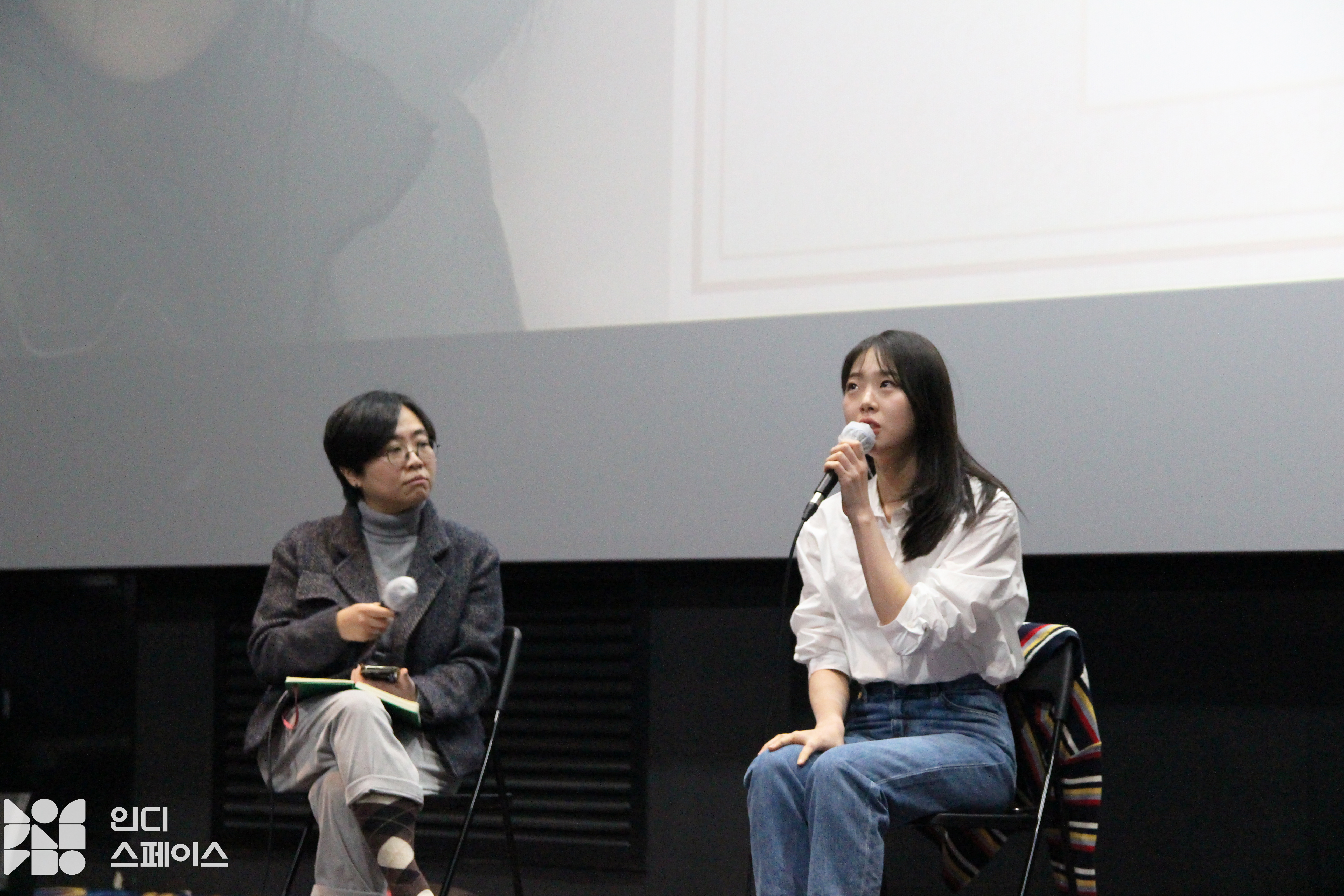 손희정 : 소희라는 사람의 신체에서부터 시작해서, 영화 후반부로 갈수록 거대한 구조의 문제로 확대되어가는 영화의 구조가 놀라웠어요. 영화를 따라가다 보니 끝에서는 정말 숨이 막히더라고요. 영화 또한 현실보다 앞서 나가지 않는 위치에서, 구조를 깨지 못하고 딱 끝나버려요. 영화가 끝나고 집으로 어떻게 돌아가야 할지 막막했습니다. 여기 함께 계시는 관객분들은 조금 다행이라는 생각이 들기도 합니다. 함께 모여서 영화를 보고 이야기를 나눈다는 것은, 그 감정들을 정리하고 영화 이후로 어떤 이야기를 할 수 있을지 함께 고민한다는 점에서 좋은 시간인 것 같아요. 이 마음을 담아 객석으로 마이크를 돌려보고 싶은데요. 관객분들의 질문을 들어보도록 하겠습니다.