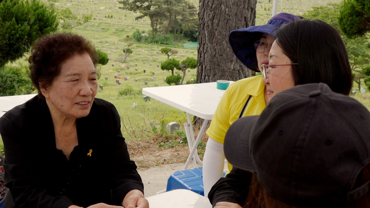 정혜윤: 사실 저희는 같은 팀이었어요. 세월호 나고 1년쯤 있다가 2015년도에 제가 세월호 유족들을 모시고 5·18 광주 어머니들 만나러 가는 일이 있었어요. 그때는 공식적인 만남은 아니었고, 어쩌다가 ‘우리 5.18 광주 어머니들 만나러 가자’고 이야기가 돼서 서울에서 출발을 했어요. 그런데 광주에 도착하니까 수피아여고 앞에 5·18 유족들이 쫙 한 줄로 서 계시더라고요. 유족과 유족이 만난 거죠. 이 영화에 나오는 것처럼 세월호 유족과 광주 5·18 유족이 만나는 자리인데 정말 만나는 순간 서로 자석처럼 끌어안더라고요. 처음 보는 사이인데 세월호 유족들이 차에서 내리자 마자 5·18 어머니들이 거의 달려들 듯이 끌어안으시더라고요. 한참 울고 나서 방에 들어갔는데, 세월호 부모님들이 5·18 부모님들 앞에서 무릎을 꿇으시더라고요. 저에게 이 장면이 너무 충격적이었어요. 세월호 부모님들이 “우리가 모르고 살았다. 당하고 나서 보니까 겪고 나서 보니까 내가 얼마나 모르고 살았는지. 진짜 미안하다.” 이렇게 사과를 하시더라고요. 그 다음 말은 제가 평생 잊을 수 없는 말이에요. 세월호 어머니 한 분이 5.18 어머니한테 이렇게 말하는 거예요.