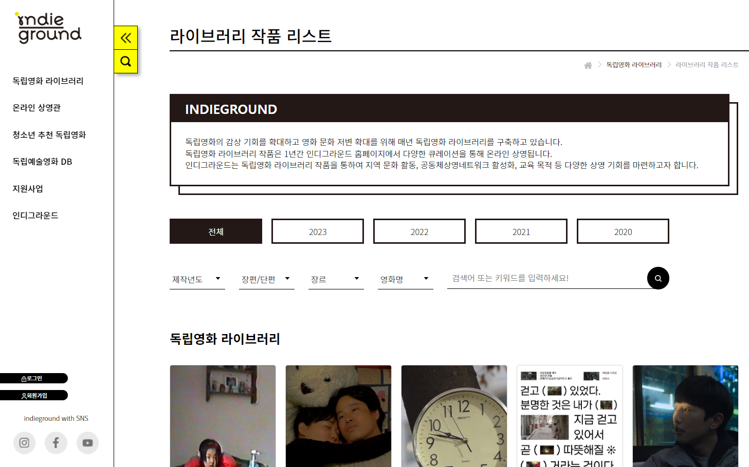 지금의 독립영화 라이브러리는 첫째, 독립영화 몇 편을 선정하여 1년 동안 온라인 상영을 통해 관객을 만나도록 지원한다. 둘째, 이 작품에 대한 공동체상영을 지원한다. 그리고 셋째, 청소년 영화교육에서 활용할 수 있도록 관람 가이드 등을 개발하고 학교, 기관, 단체 등과 매개한다. 마지막으로 독립영화 라이브러리는 아카이브의 역할도 생각하고 있다. 한국영상자료원이나 영화진흥위원회에서도 아카이브나 데이터베이스가 있지만 인디그라운드는 독립영화에 초점을 맞추고 있다.